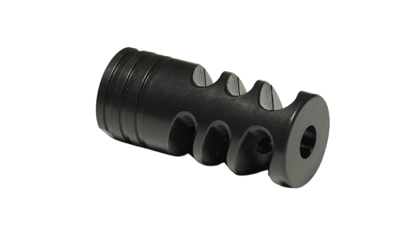 The BrakeyMcBrakeface was designed and manufactured right here in Ontario using durable 4150 barrel steel, then finished in a tough black nitride coating for corrosion resistance and a clean, glossy appearance.